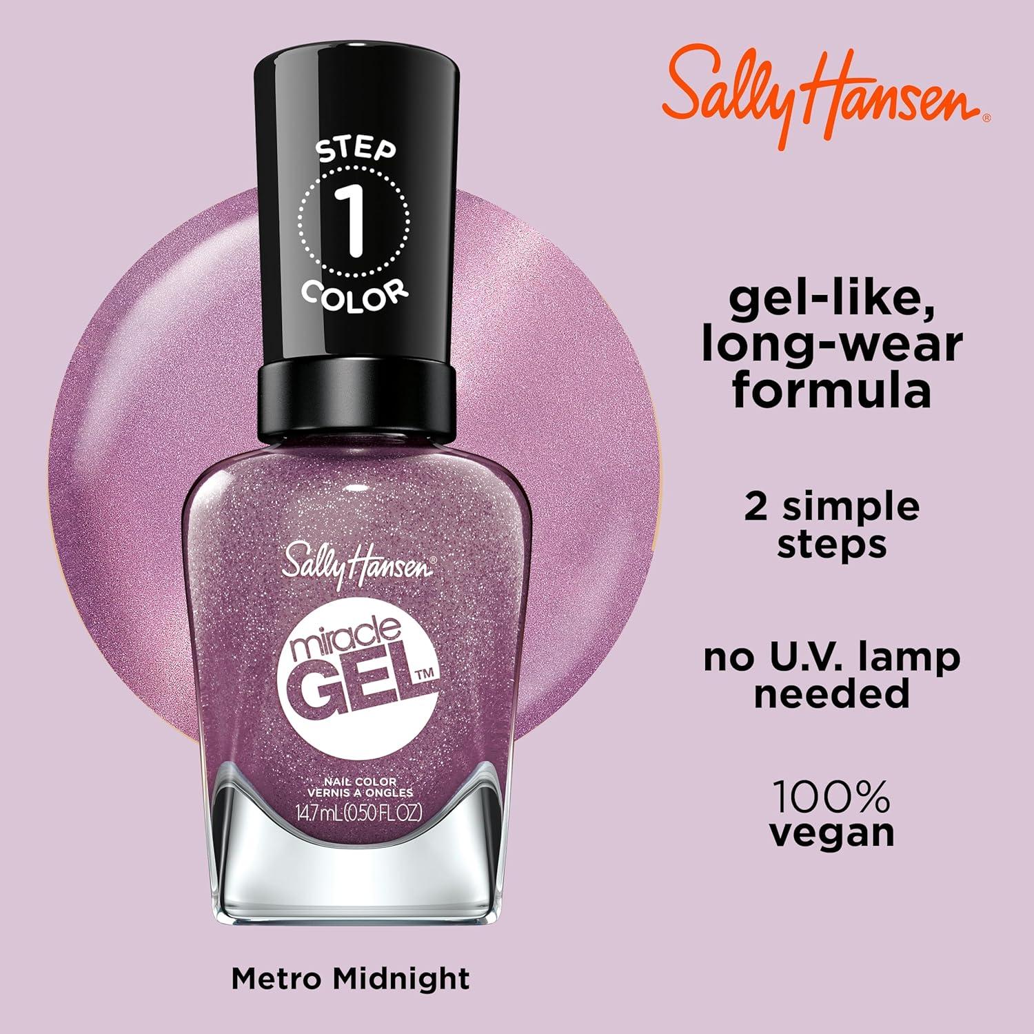 Sally Hansen Miracle Gel Salon Quality Nail Polish | Gel-Like Formula, Two-Step System, No UV Light Needed, Long Lasting | Opaque, Shimmery | 529 Hunger Flames | Purple Nail Color(564 Metro Midnight)