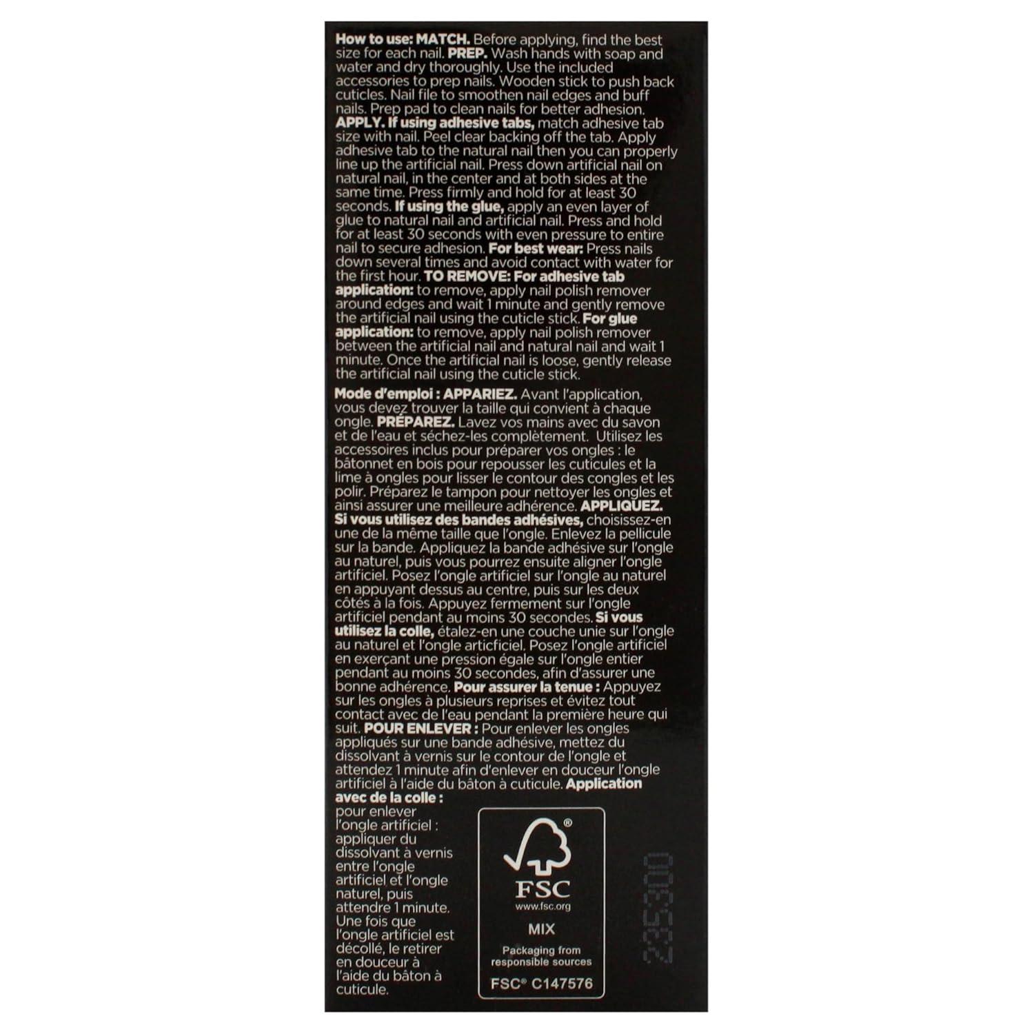 24 nails, file, cuticle stick, prep pad, adhesive tabs & nail glue included.